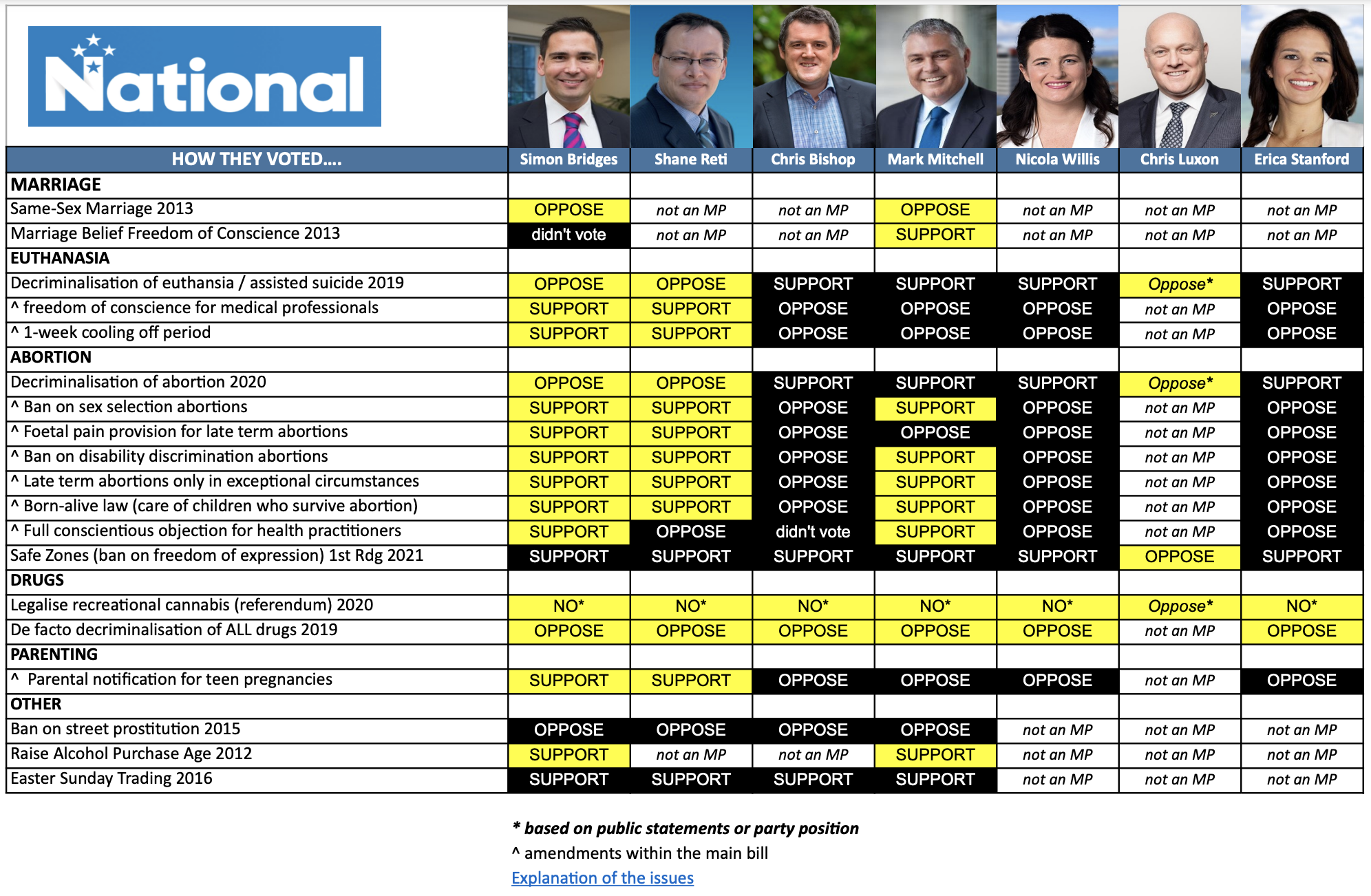 For a full explanation of the voting issues listed, CLICK HERE. Please also note that for Christopher Luxon who only entered Parliament last year, we have relied on his public statements for a couple of the big issues.