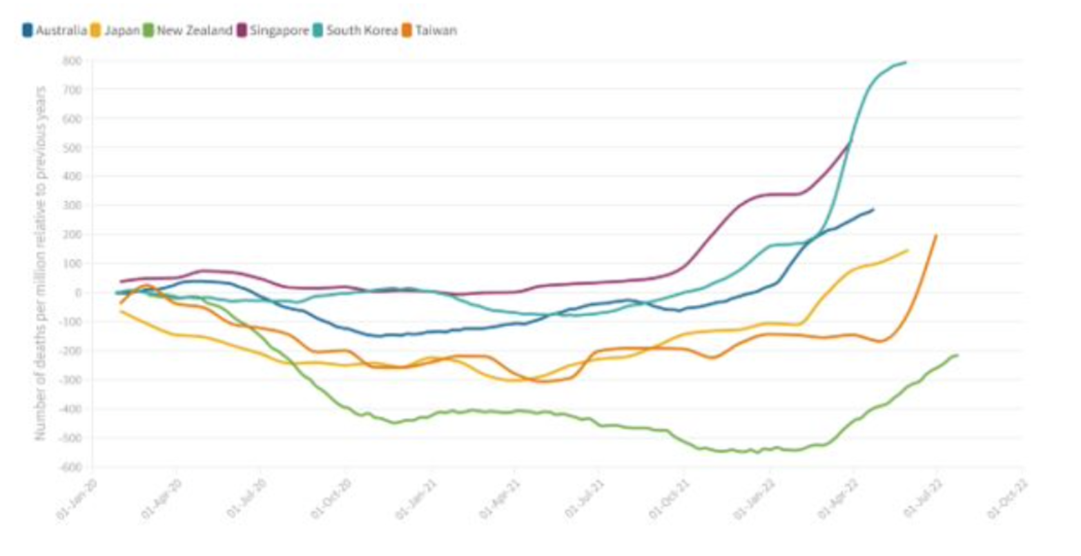 In 2020 there were virtually no Covid infections and no vaccines. The closure of borders and lockdowns ensured there was no flu season. All-cause deaths were very low. For most of 2021 lockdowns continued and Covid cases were very low, vaccines were rolled out. Deaths rose and peaked parallel to the vaccine uptake. In 2022 all-cause deaths have risen dramatically. Deaths because of Covid form a very small percentage of the all-cause deaths.