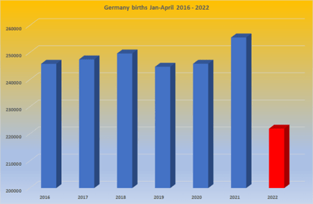 Germany – figures are available for January to April. If we compare the number of births to the same time period from 2016 to 2022 we see this:
