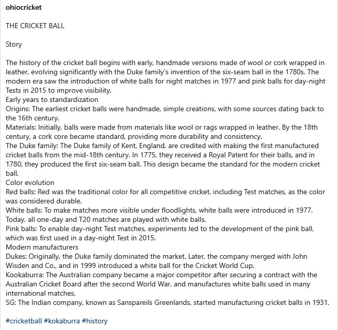 The earliest versions of cricket balls had no standard size, weight or stitching: they were handmade by locals and consisted of a round leather case filled with materials such as cork or wool.
