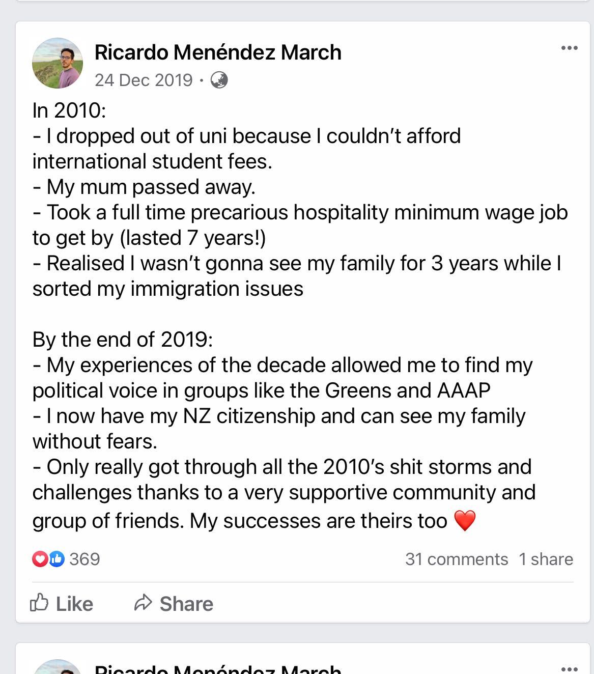 But Ricardo was forced to find work. He got jobs in hospitality for a few years, became a NZ resident, went back to uni to finish his studies, and then entered politics. Once he was there, he wished he had done it sooner.