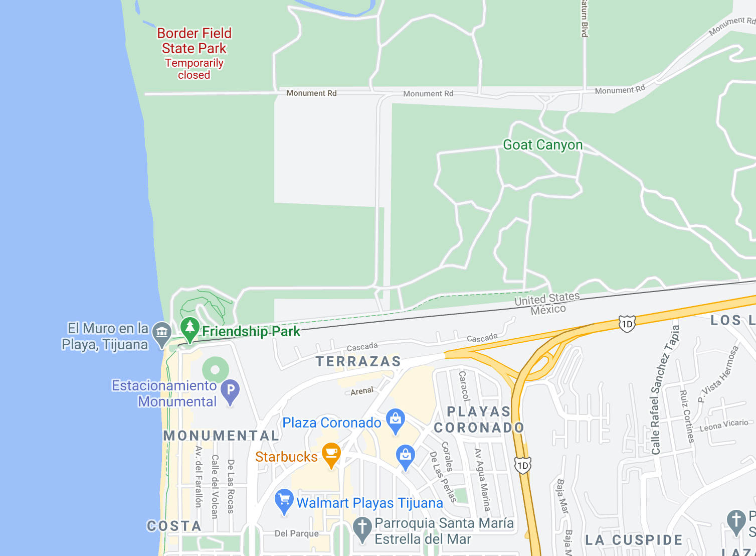 In fairness to Ricardo, most of this is technically true. His family house was indeed less than 200m from the border… in the upmarket beach suburb of Playas de Tijuana in the western part of the city. Playas is sometimes called Playami, punning on Miami, because it’s popular with well-heeled San Diegans. The park is Border Field California State Park. So far, so aesthetic.
