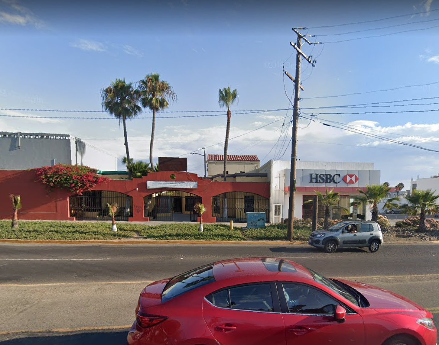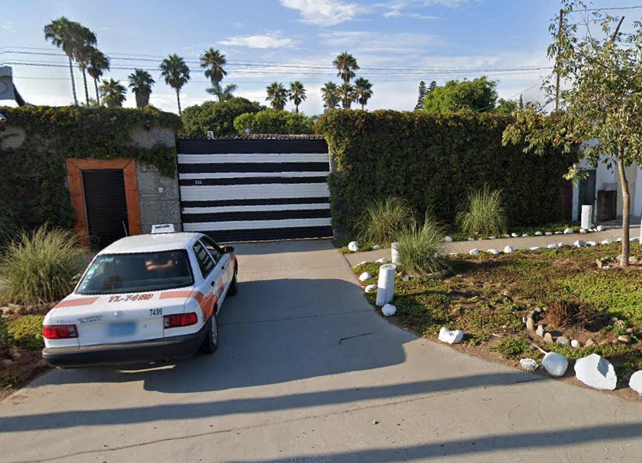 From the photo above taken from the driveway, we can see a distinctive red roof, a power pole and three palms. A look on Google Maps easily identifies the same location: