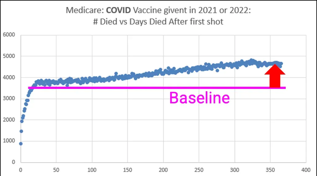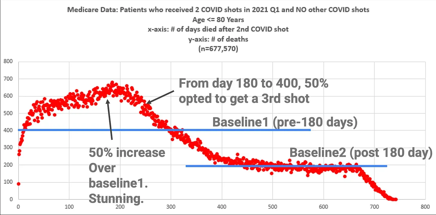 Since Medicare has one of the most comprehensive data sources to answer that question (as Medicare tracks when each member is vaccinated and when they die), Kirsch has been working diligently to get that data. Likewise, Medicare was cited by the FDA in the same way VAERS was—as a way to monitor the safety and efficacy of the vaccines.
