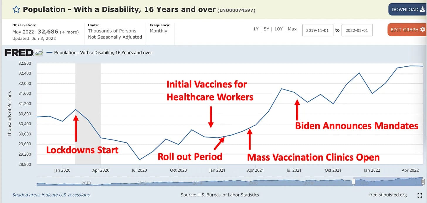 - Population wide datasets showing a massive increase in deaths and disabilities. Since COVID occurred throughout 2020, whereas the vaccines were introduced at the start of 2021, those datasets frequently make it quite easy to identify the impact of the vaccines.
