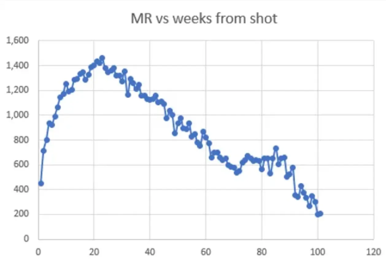 This graph again shows that the COVID vaccine dramatically increases your risk of dying (Mortality Risk or “MR”), and sadly, that this effect persists for months afterwards.