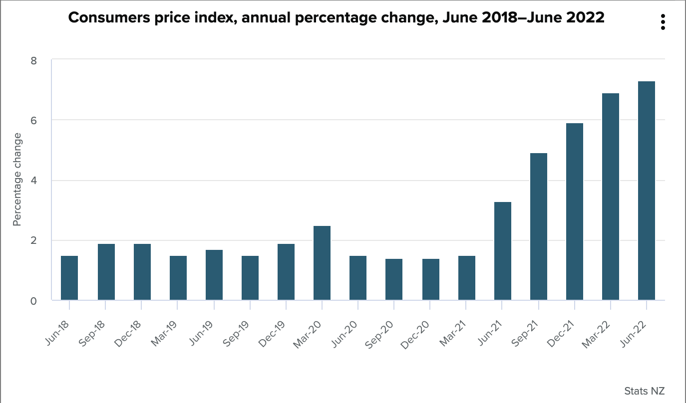 Stats NZ has released its quarterly consumers price index for the three months leading up to June. Inflation rose from 6.9% in March to 7.3%, with food up 1.3% and 2.3% rises in transport as well as housing and household utilities.