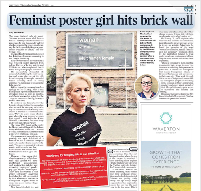 How crazy is it that putting up a poster that does nothing more than give the literal definition of the word woman has been described by Police in the UK as “hate speech” and “transphobic”!