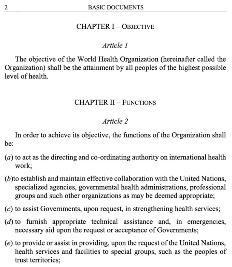 - The WHO Constitution states that, “The WHO is the directing and coordinating authority on international health work.” Recently, to justify becoming the global director of health, the WHO disingenuously dropped the last word–and began claiming it already was “the directing and coordinating authority on international health.” But it is not and never has been. The WHO has always been an advisory body, responding to requests for help from member states. It has never previously been a directing or governing body with authority to govern member states. Here is the relevant part of its Constitution, on page 2: