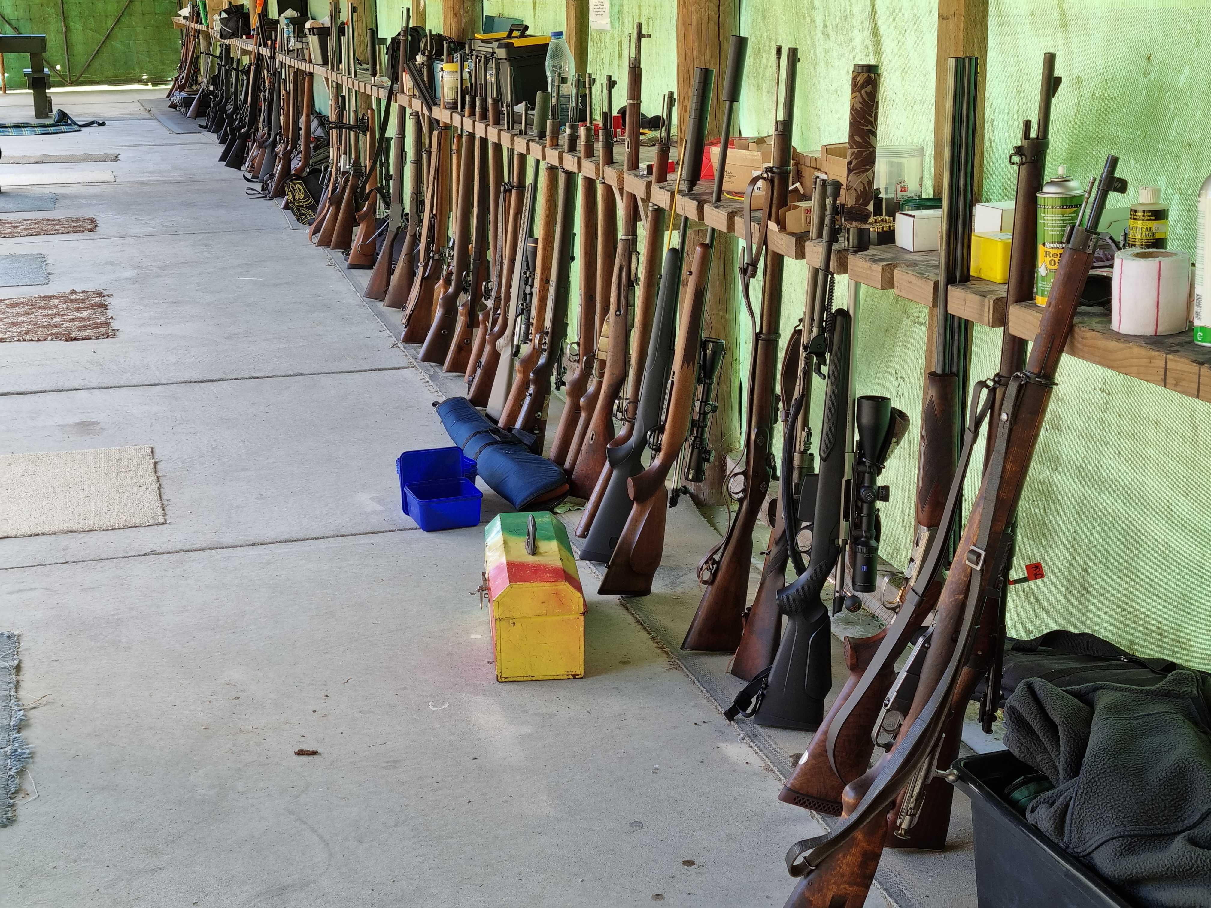 The full array of firearms at a military rifle range day for just twelve shooters