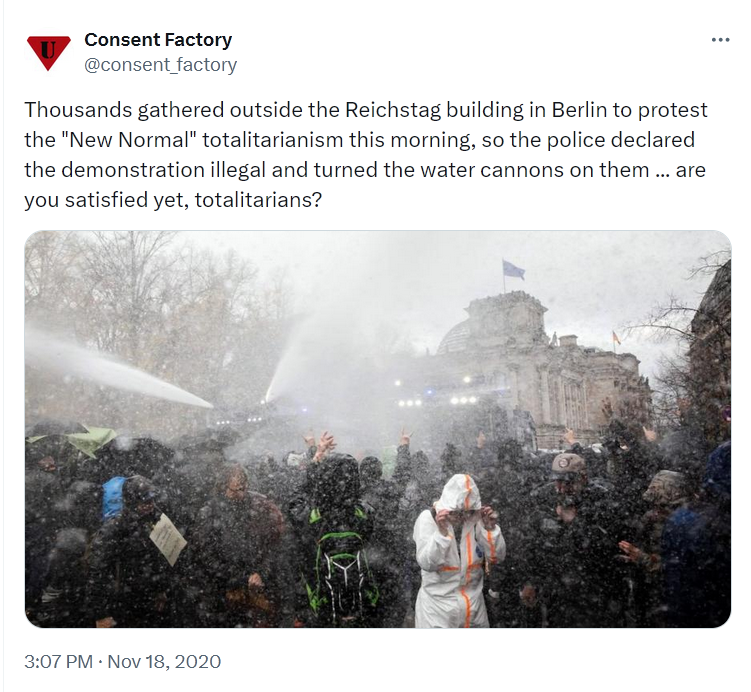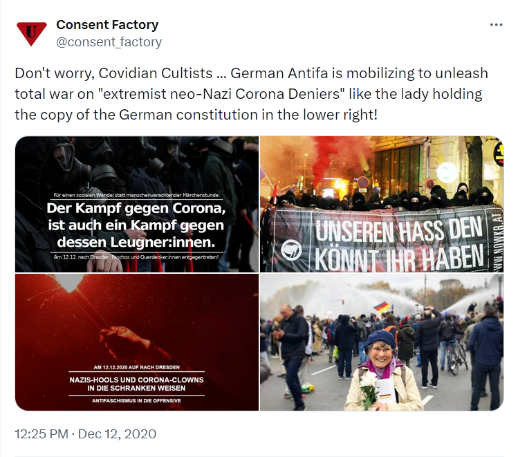 And, while the commission is inquiring into the possibly slightly inappropriate behavior of their law enforcement officials, they might want to also take a look at the behavior of their unofficial goon squads, like Antifa, which they accidentally encouraged to attack the ‘anti-vaxxers,’ the ‘Covid deniers,’ and anyone brandishing a copy of the German constitution.