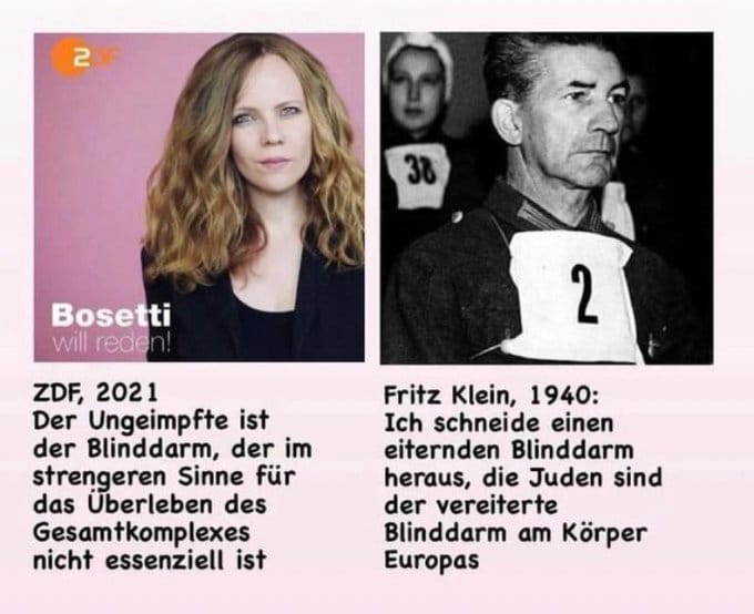 Come to think of it, the Inquiry Commission might also want to look into how the German authorities, and the overwhelming majority of the state and corporate media, accidentally systematically fomented mass hatred of anyone who dared to question the government’s arbitrary and nonsensical decrees or who refused to submit to ‘vaccination,’ and publicly demonized us as “Corona deniers,” “conspiracy theorists,” “anti-vaxxers,” “far-right anti-Semites,” etc, to the point where mainstream German celebrities like Sarah Bosetti were literally describing us as the inessential “appendix” in the body of the nation, quoting an infamous Nazi almost verbatim.
