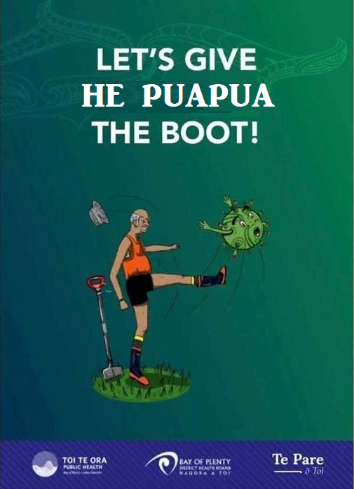 Cartoon images depicted the virus with a moko [traditional Maori tattoo]; one showed the moko-wearing virus was being kicked by a Pakeha man in gumboots alongside the words: Let’s give Covid-19 the boot! Another featured a person in full Covid-style protective equipment standing on top of the virus, with a tewhatewha [a traditional Maori weapon] in hand.