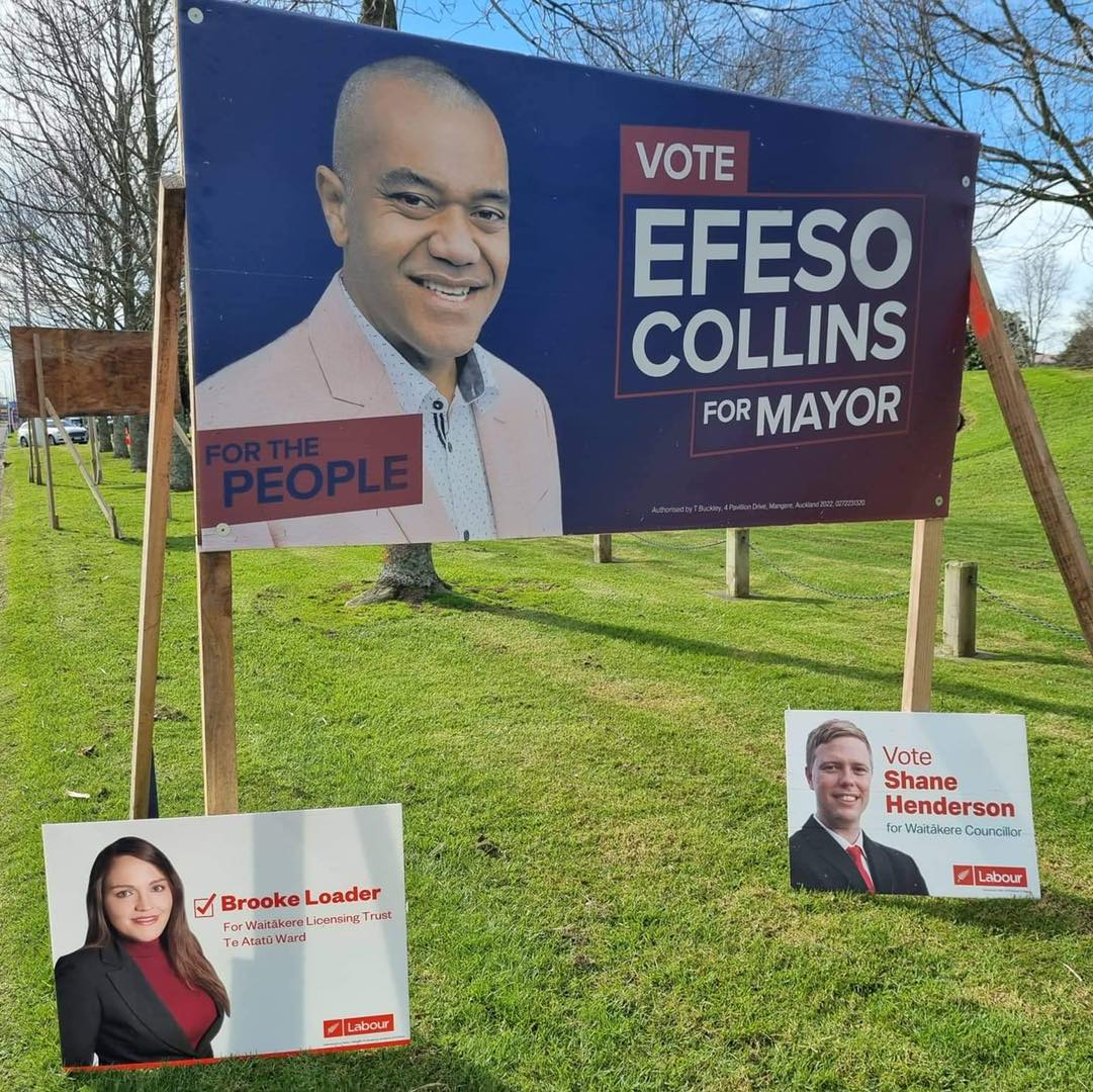 Take Labour and Green endorsed Mayoral candidate Efeso Collins. His signs are all pretty much blue with a hint of purple. Not a shred of red to be seen.