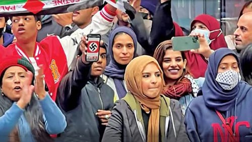 In one image that has gone viral, a protester held up a swastika to taunt pro-Israel counter-demonstrators — many of whom were Jewish.