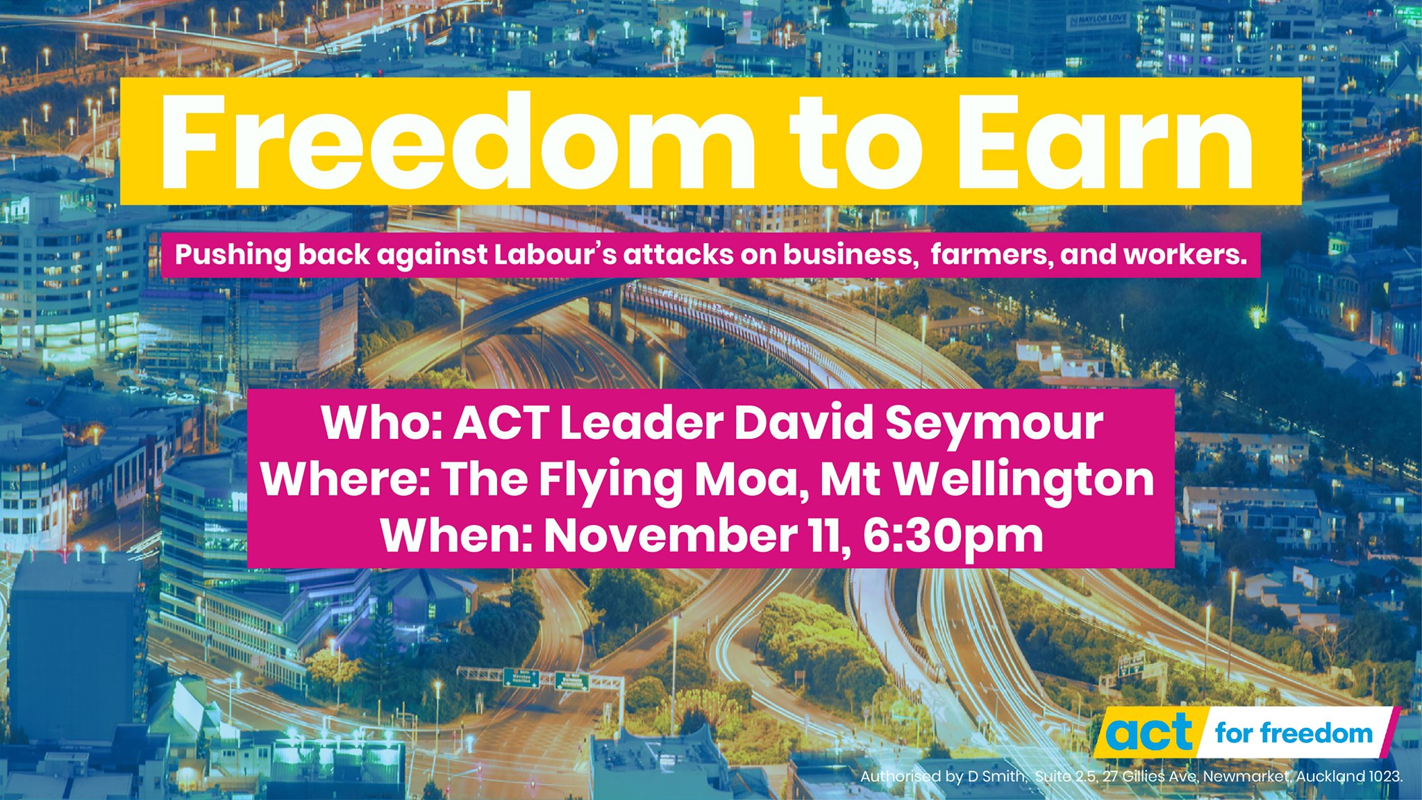 ACT stands for economic freedom. Only the creative energy of a free society will get us through these next few difficult years. Join David Seymour and Stephen Berry in Mt Wellington to discuss how ACT will promote economic freedom and push back on Labour’s economic record.