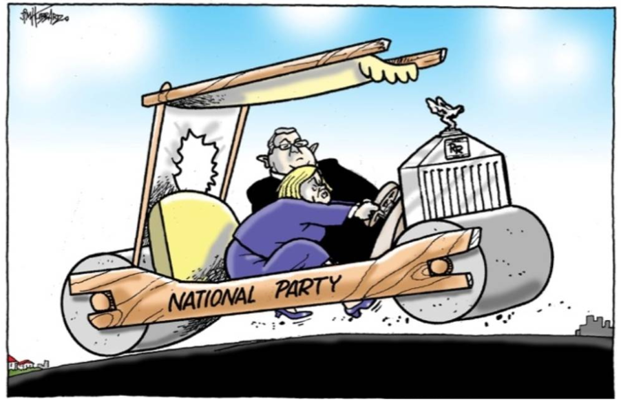 The plagiarised theme is woefully unoriginal, obviously, but unintentionally accurate as Judith grimaces getting traction, taking the load of an uphill battle without complaint, just doing the hard work to get the Nat’s over the rise and, as we all know, thanks to her energy, her impetus, her inertia, once those heavy rollers are moving – they’ll be bloody hard to stop.
