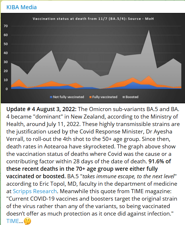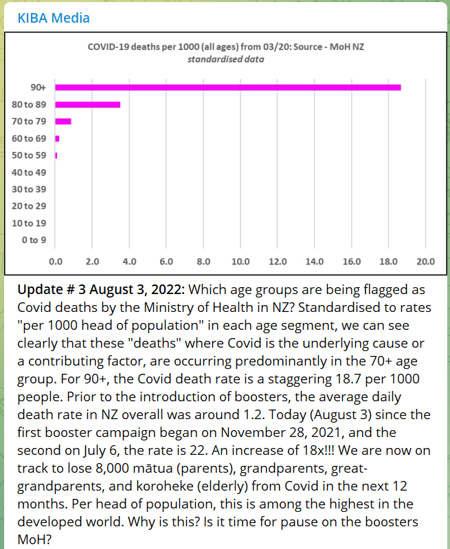 In the Today FM article the increase in deaths was attributed to COVID-19 and the re-emergence of flu when NZ borders opened. NZ has one of the highest vaxed and boosted populations in the world. Who and why are people dying from COVID-19? KIBA Media answer the question in their review of NZ data. Since the first booster campaign in November 2021 overall there has been an 18-fold increase in deaths, despite Omicron being the dominant variant. And the brunt of that has been borne by the elderly.