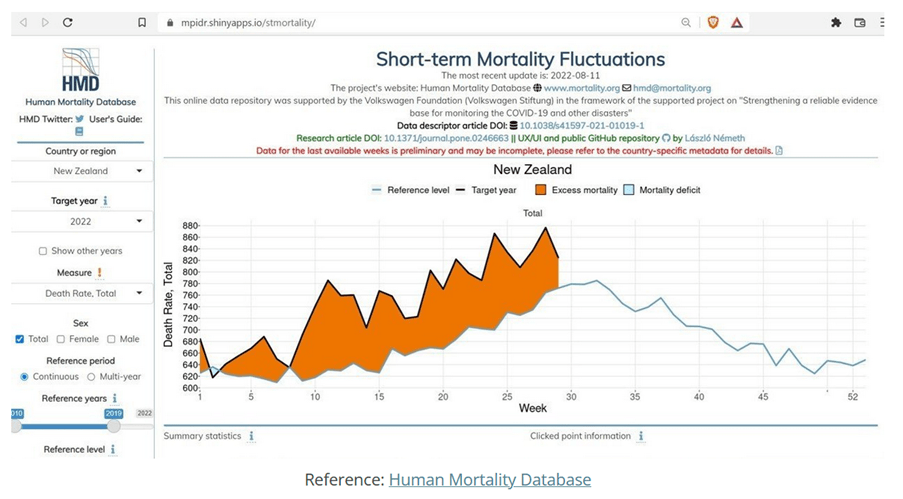 Rachel Benns, President of the NZ Funeral Directors Association knows more people are dying. And she knows to compare current deaths to pre-2020 data. In a radio interview on TodayFM on 20th July 2022, Ms Benns estimated that there has been a 15% increase in deaths in NZ from 2018/2019 figures.