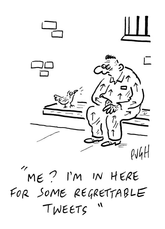 Among Jonathan Pugh’s works is a cartoon of a prisoner telling a bird about making ‘some regrettable tweets’.