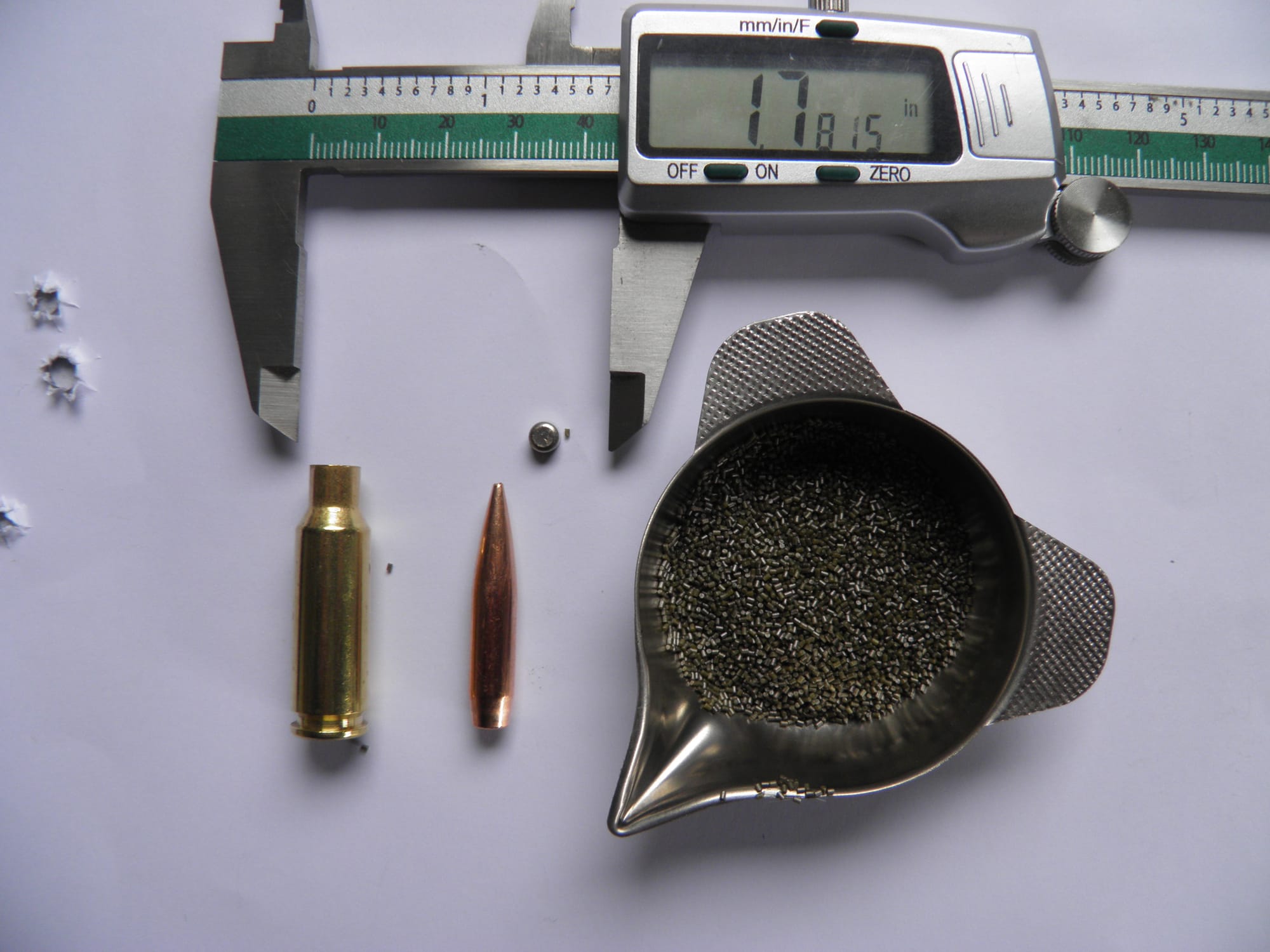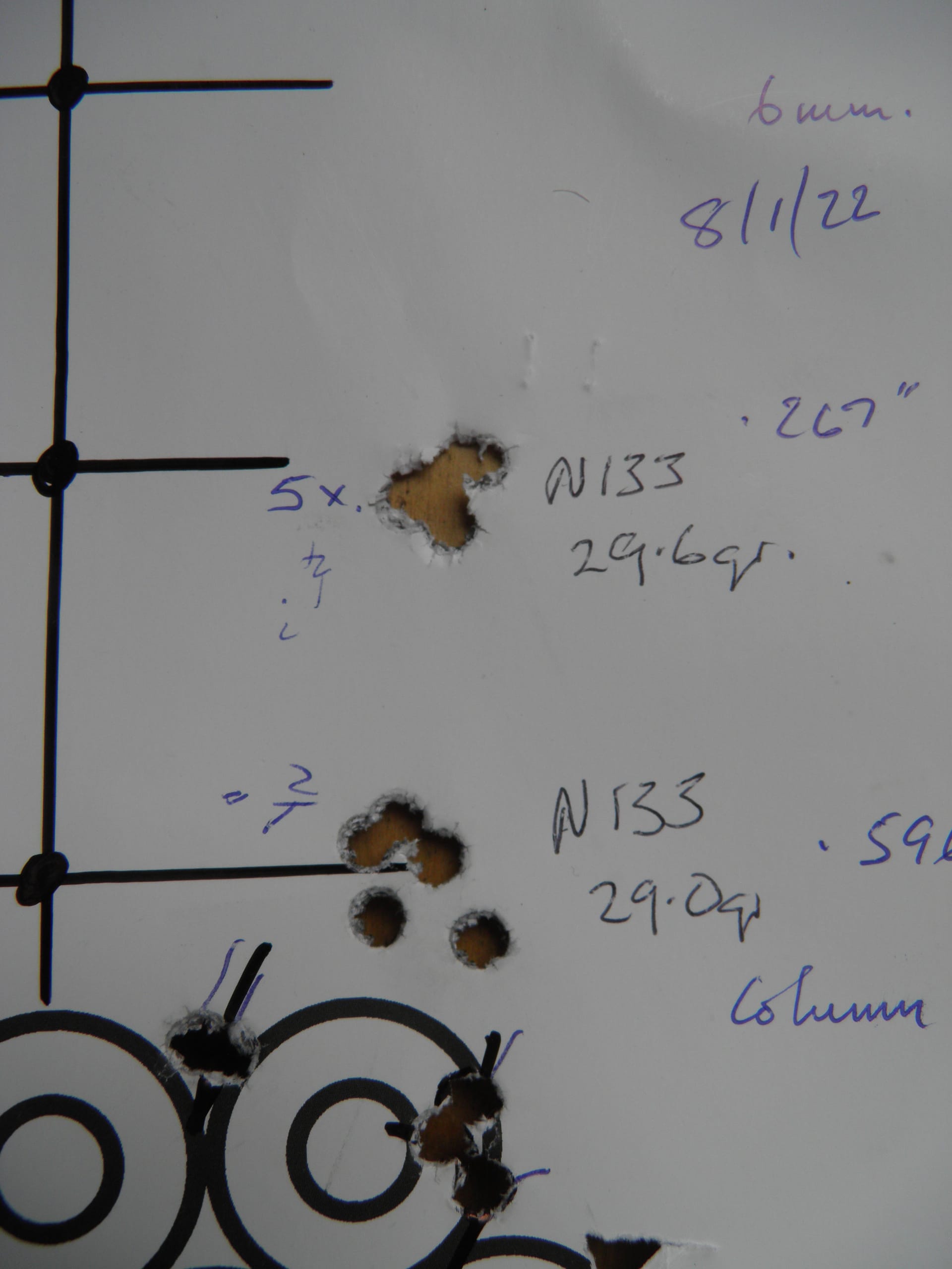 This has proved to be too light, producing a vertical string of hits, so one has to exceed the recommendations – with care – until a small round group results. (I use 29.6 grains and another mate goes up to 30.2 grains – well over the suggested maximum).