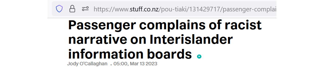 A passenger (a relatively rare species currently) on the Interislander and member of the swinging offenderatti set felt it necessary to feign umbrage upon viewing historical ‘blurbs’ incorporated into a display map aboard the vessel Aratere, sharing her disgust with the world and press, especially at the use of the words ‘cannibal’ and ‘tomahawk’ in describing some notable events in relation to the Marlborough Sounds. The former describing the feasting at the fall of Kaiapoi Pa and again in the unfortunate demise of crew from Cook’s second voyage, the latter in the despatch of the surrendered folk at what became known as the ‘Wairau affray’.