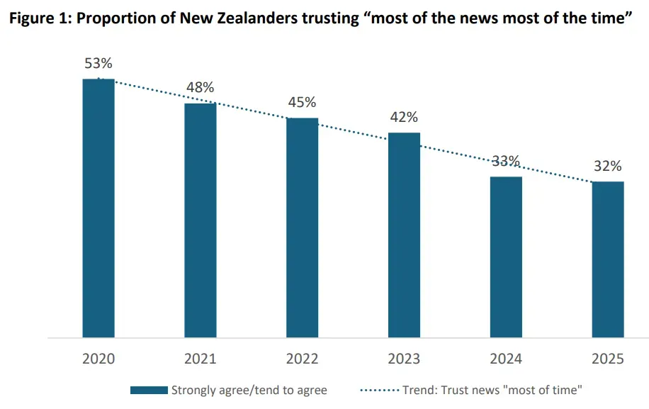 - 📉 Trust in mainstream New Zealand media has declined to 32%, below the global average of 40%.