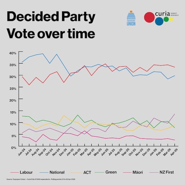 - 🔼 New Zealand First up by 3.9% to 13.6%