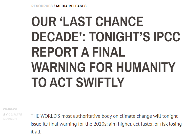 But hang on a minute, the Australian Climate Council has cunningly slipped the word “decade” into their interpretation of the latest IPCC doom porn.